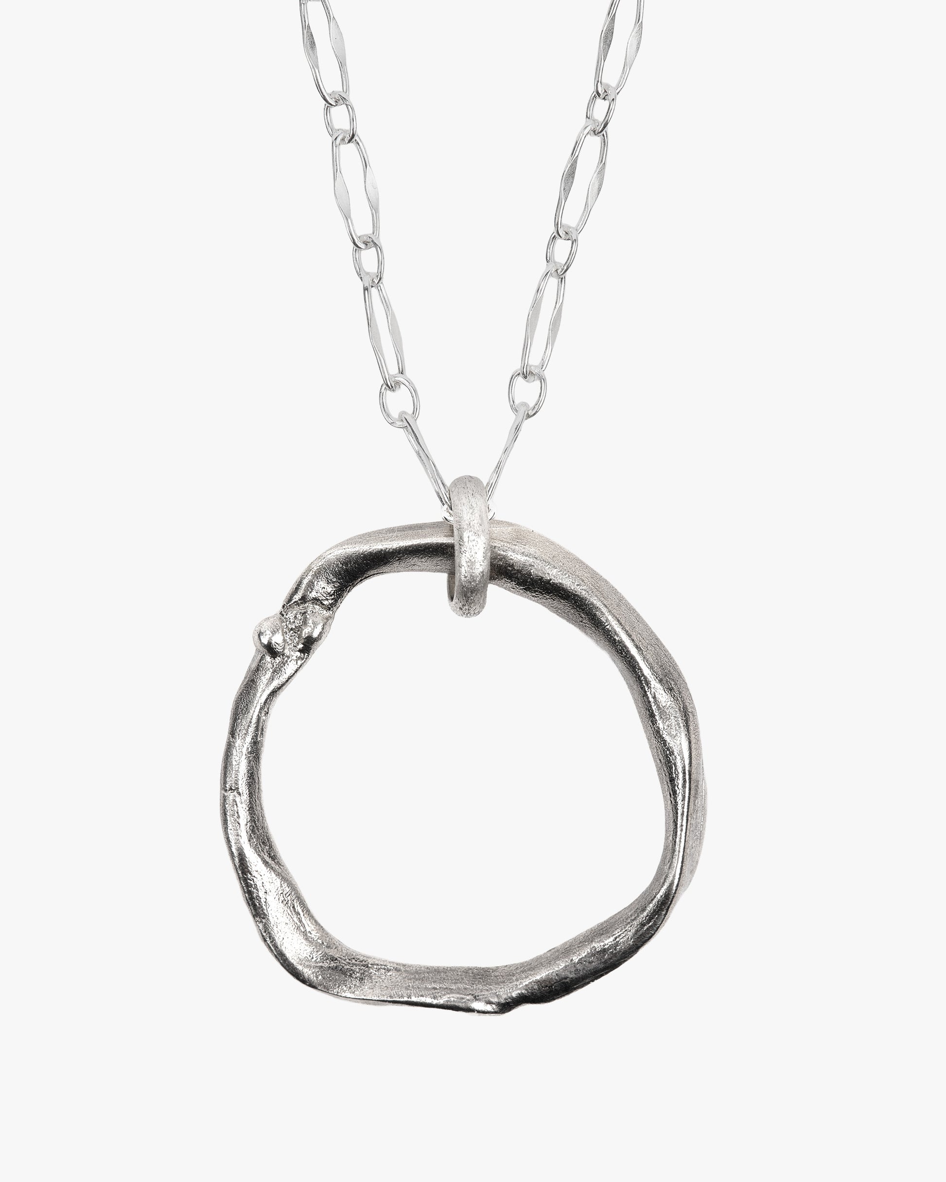 Like a circle shaped by the currents, this textured silver pendant bears the unseen memory of erosion: every undulation speaks of water’s passage and the flow of time.