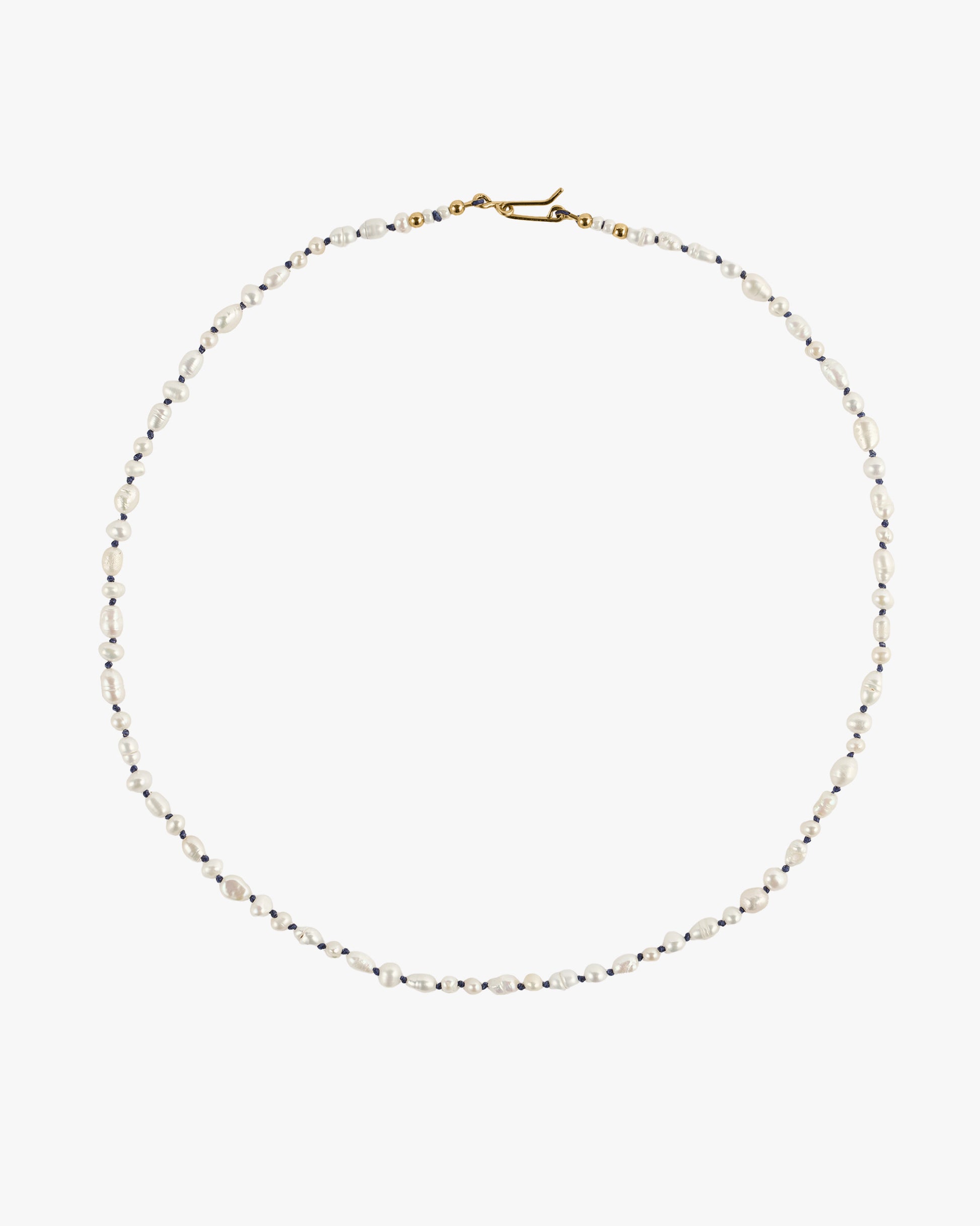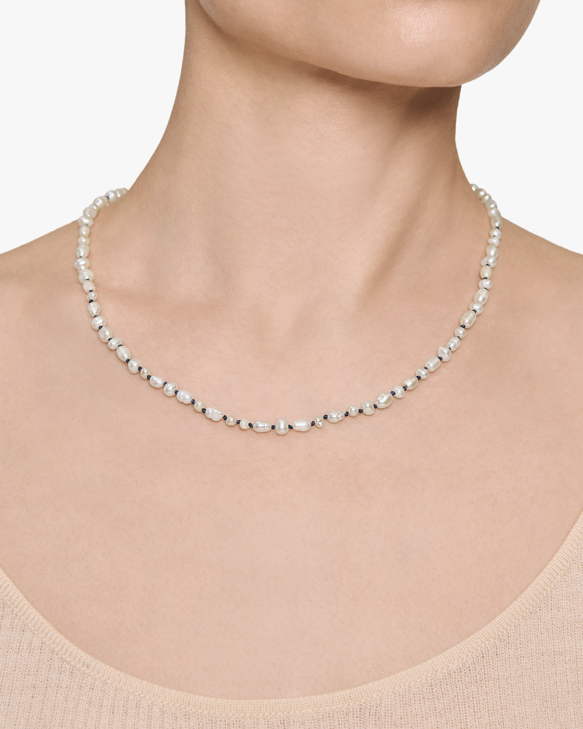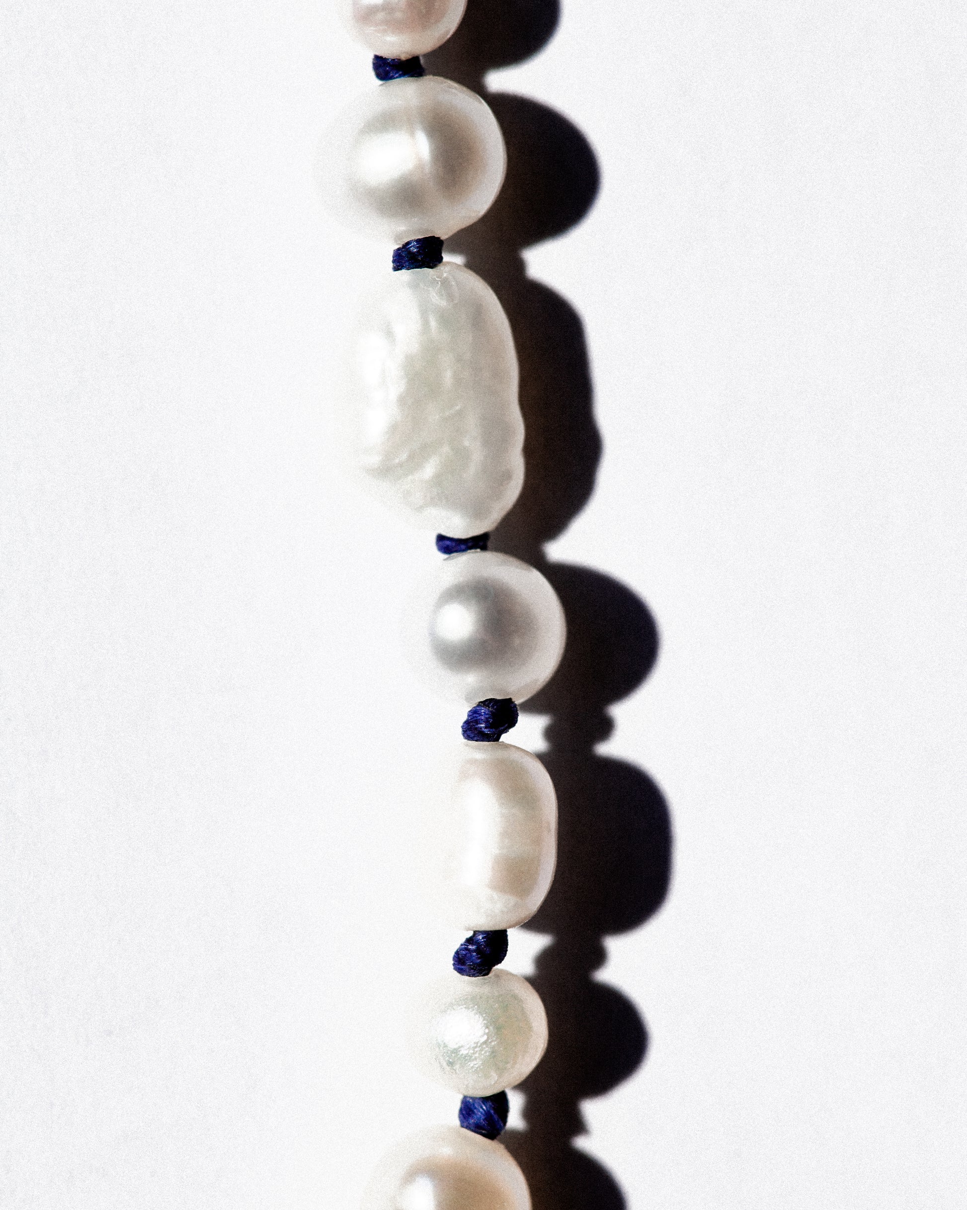 The Maureen necklace is a delicate and refined piece, crafted from carefully selected freshwater pearls. Strung on a midnight blue thread, each pearl is individually hand-knotted.
